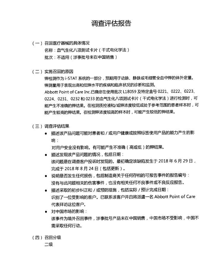 雅培貿(mào)易(上海)有限公司報(bào)告,由于涉及產(chǎn)品可能存在鉀離子的檢測結(jié)果不準(zhǔn)確的問題,生產(chǎn)商Abbott Point of Care Inc.對(duì)血?dú)馍隧?xiàng)測試卡片(干式電化學(xué)法)i-STAT CG8+ Cartridge(注冊(cè)證編號(hào):國械注進(jìn)20182401622)主動(dòng)召回。召回級(jí)別為二級(jí)。涉及產(chǎn)品的型號(hào)、規(guī)格及批次等詳細(xì)信息見《醫(yī)療器械召回事件報(bào)告表》。