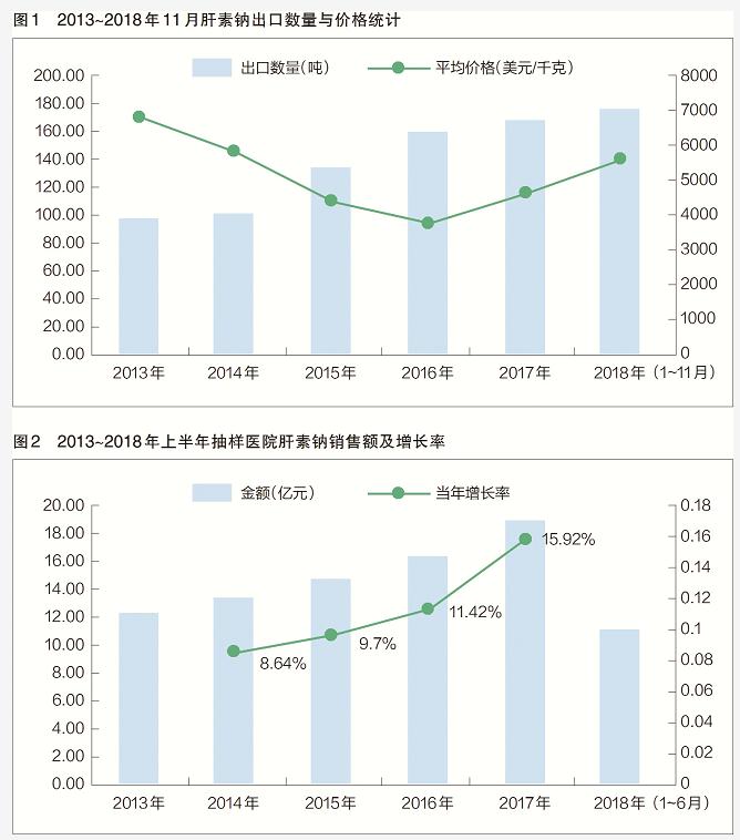 出口產(chǎn)品也在不斷向高端發(fā)展。其中,低分子肝素的出口增長較快,近5年出口量平均增長率達25%,2013年出口低分子肝素2噸多,而2018年前11個月低分子肝素出口量已達7噸。