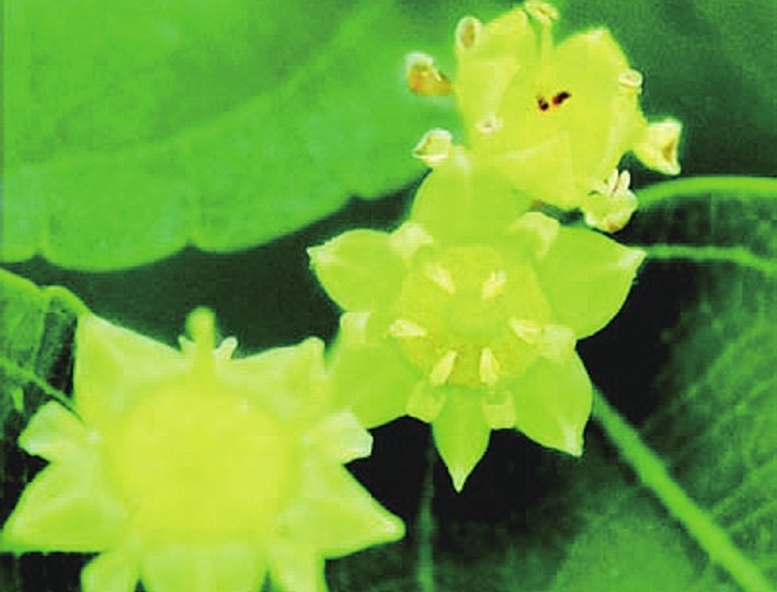 花小,2~3朵簇生于葉腋;花瓣黃綠色,與萼互生。