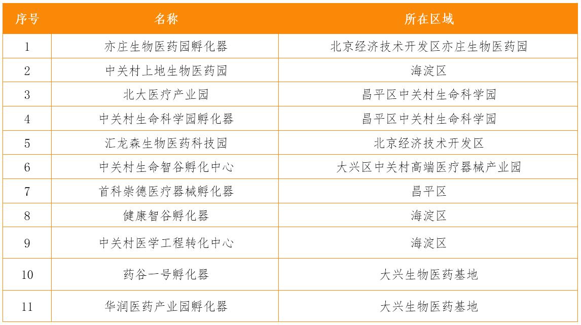 表2 北京市醫(yī)藥健康產(chǎn)業(yè)專業(yè)孵化器