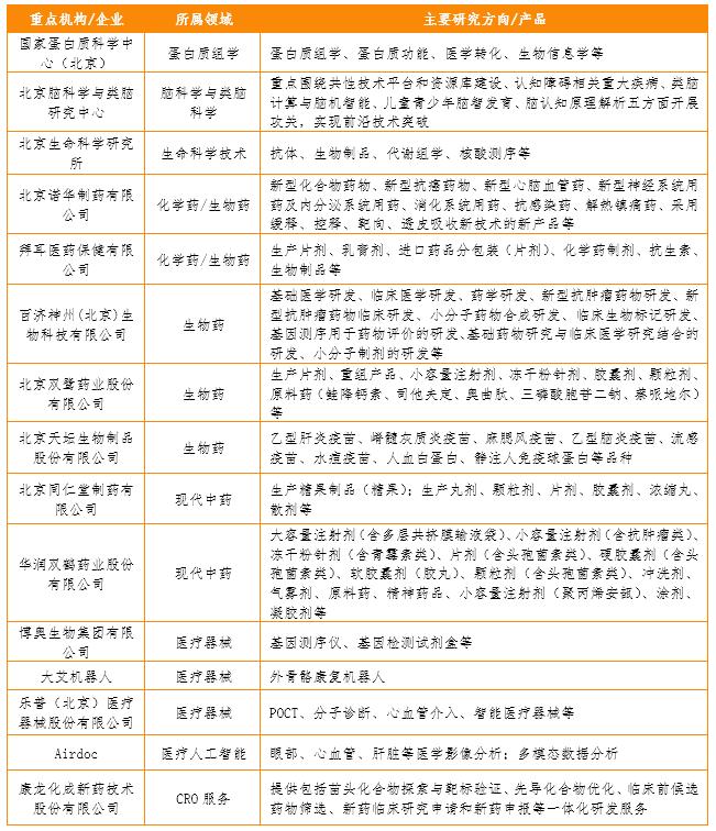 表1 北京市醫(yī)藥健康產(chǎn)業(yè)各細(xì)分領(lǐng)域重點(diǎn)機(jī)構(gòu)/企業(yè)(部分)