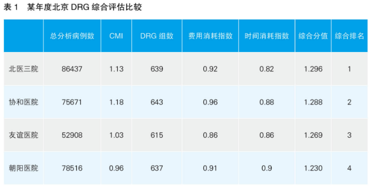 另外,DRG系統(tǒng)中的參數(shù)還可以用來橫向比較各個醫(yī)院的臨床治療綜合水平。如表1所示,北京協(xié)和醫(yī)院CMI和總DRG組數(shù)(即病例構(gòu)成的寬度)均在所有參比醫(yī)院中處于領(lǐng)先地位,但在綜合參考費用和時間消耗因素上落后,綜合排名位列第二。DRG相關(guān)指標(biāo)能將以前難以量化的醫(yī)療服務(wù)質(zhì)量轉(zhuǎn)變?yōu)榭闪炕闹笜?biāo),使醫(yī)院和科室的雙橫向比較成為可能。而且醫(yī)院和科室之間科學(xué)量化的比較,能使優(yōu)勢醫(yī)院和科室更透明,這將促進(jìn)醫(yī)院科室之間對高新技術(shù)引進(jìn)和應(yīng)用的競爭。