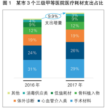 DRG的實施使藥品和醫(yī)療器械耗材從醫(yī)院的利潤中心轉(zhuǎn)變?yōu)槌杀局行模瑥氖杖雭碓崔D(zhuǎn)變?yōu)榭刭M目標(biāo)。據(jù)相關(guān)研究表明,醫(yī)療耗材支出的增長幅度高于醫(yī)院收入的增長,這將導(dǎo)致醫(yī)院對耗材的控費更為緊迫。以圖1為例,可收費的醫(yī)療耗材的支出,如心血管介入類等占比一直在增加,而不可收費的醫(yī)療耗材,如部分手術(shù)材料、消毒供應(yīng)類耗材的采購金額占比則呈明顯下降趨勢。