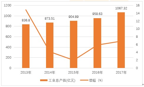 2017年,上海市生物醫(yī)藥工業(yè)總產(chǎn)值首次突破1000億元,同比增長6.9%(見下圖)。另據(jù)上海市科委數(shù)據(jù)顯示,上海市2017年生物醫(yī)藥產(chǎn)業(yè)經(jīng)濟(jì)總量達(dá)到3046.42億元,同比增長5.82%。