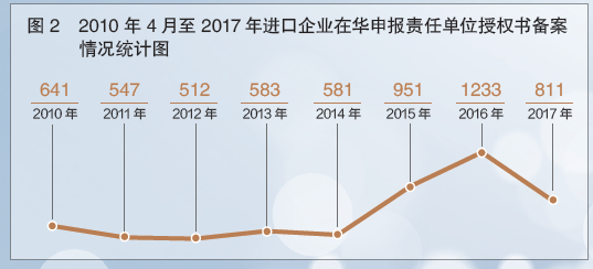 自2010年4月7日首家進(jìn)口企業(yè)法國(guó)歐潤(rùn)芙公司授權(quán)上海法妝商務(wù)咨詢有限公司作為在華申報(bào)責(zé)任單位的申請(qǐng)通過(guò)備案以來(lái),2011年至2015年的備案情況基本保持穩(wěn)定,2017年呈下降趨勢(shì)。其中,2015年至2016年備案數(shù)逐步上升,究其原因,主要有兩個(gè)方面:一是受856號(hào)文規(guī)定的在華申報(bào)責(zé)任單位授權(quán)書(shū)的授權(quán)有效期至少為4年,自首次進(jìn)行在華申報(bào)責(zé)任單位備案4年后,部分生產(chǎn)企業(yè)因授權(quán)到期而重新授權(quán);二是更多的進(jìn)口企業(yè)進(jìn)行首次授權(quán)備案(見(jiàn)圖2)。