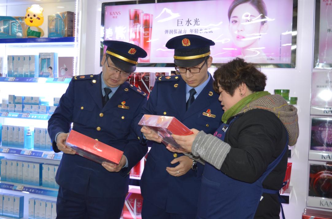 圖為該局執(zhí)法人員正在一家超市對一款美白保濕類套裝外包裝進行檢查。孫建新 周建莉 攝影報道