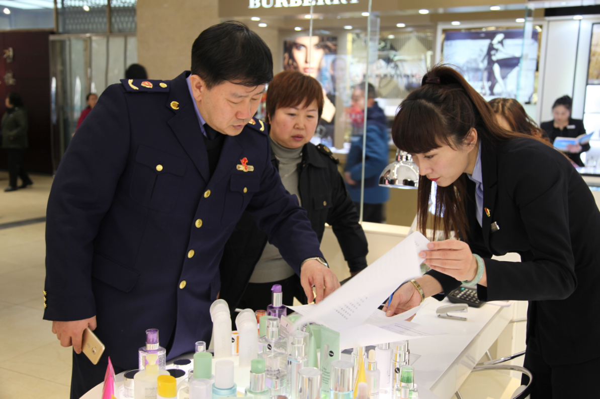 圖為執(zhí)法人員在延吉百貨大樓化妝品專柜進(jìn)行檢查