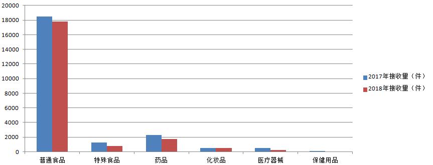 投訴舉報(bào)信息從地區(qū)分布情況來(lái)看,接收最多的地區(qū)是西安市(9364件),占投訴舉報(bào)信息總量的44.2%;其次為陜西省藥監(jiān)局投訴舉報(bào)大廳(3324件),占總量的15.7%。從產(chǎn)品種類來(lái)看,普通食品17798件,占84.1%;藥品、特殊食品、化妝品、醫(yī)療器械、保健用品,分別占8.3%、3.7%、2.4%、1.3%、0.3%。與2017年相比,除化妝品外,其余的普通食品、特殊食品、保健用品、藥品和醫(yī)療器械投訴舉報(bào)信息總量均有所下降。