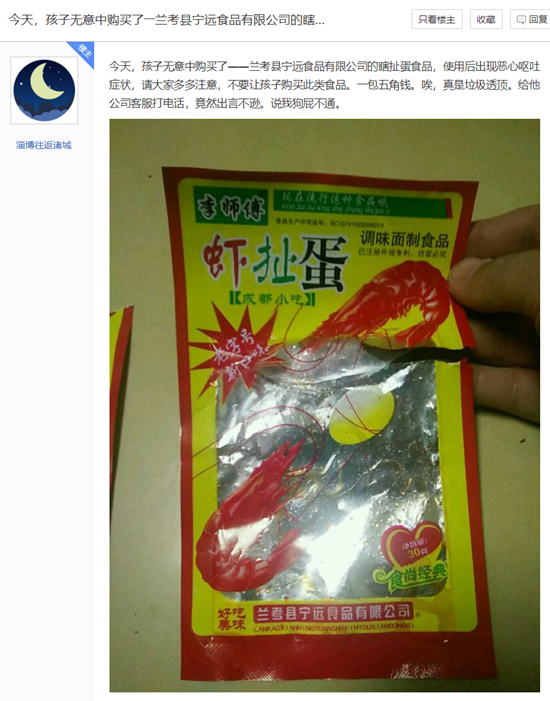 在晚會上,特別提及了辣條的品牌為“蝦扯蛋辣條”。目前淘寶和京東都搜索不到“蝦扯蛋辣條”。記者在網(wǎng)上搜索了有關“蝦扯蛋辣條”的信息,發(fā)現(xiàn)在2018年初就有網(wǎng)民在網(wǎng)上曝光“蝦扯蛋辣條”,稱孩子購買食用后出現(xiàn)惡心、嘔吐等癥狀。