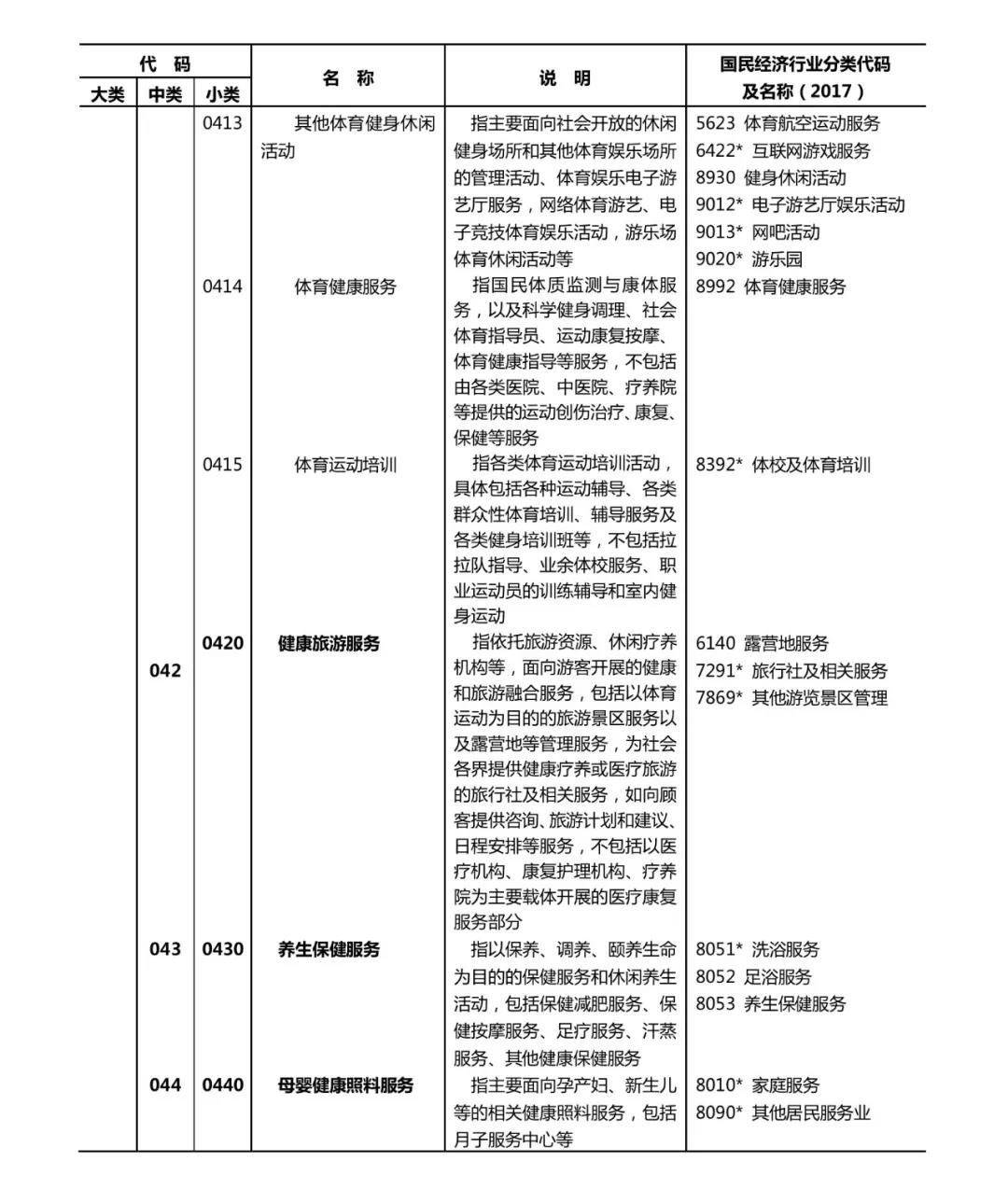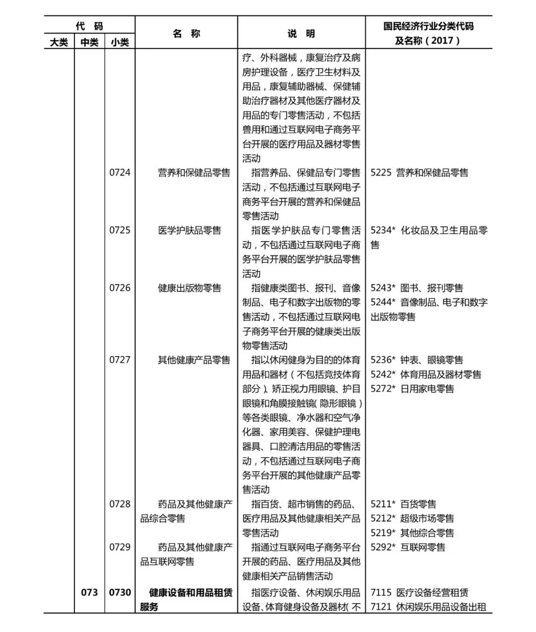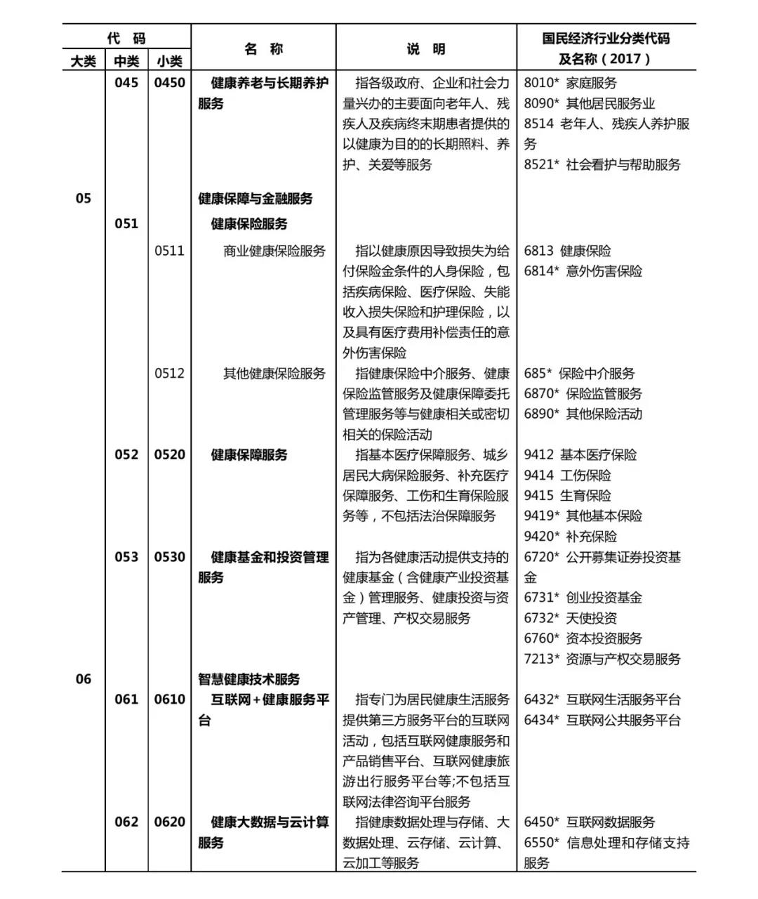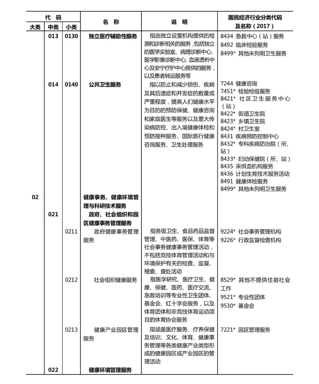 (一)本分類建立了與《國民經(jīng)濟行業(yè)分類》(GB/T 4754-2017)的對應關(guān)系。在國民經(jīng)濟行業(yè)分類中僅部分活動屬于健康產(chǎn)業(yè)的,行業(yè)代碼用“*”做標記。