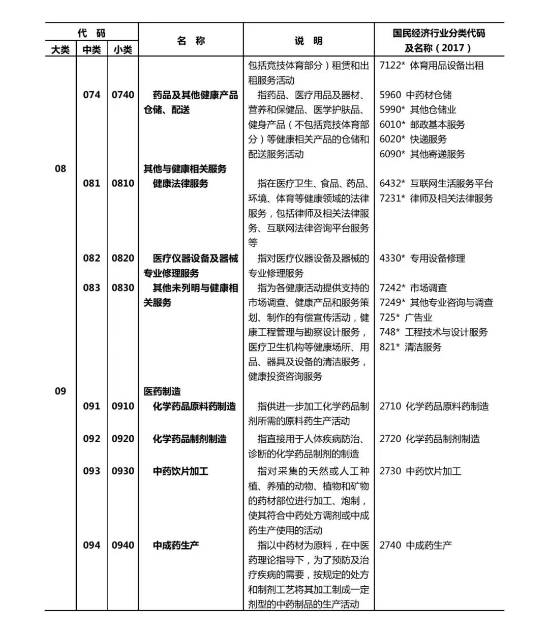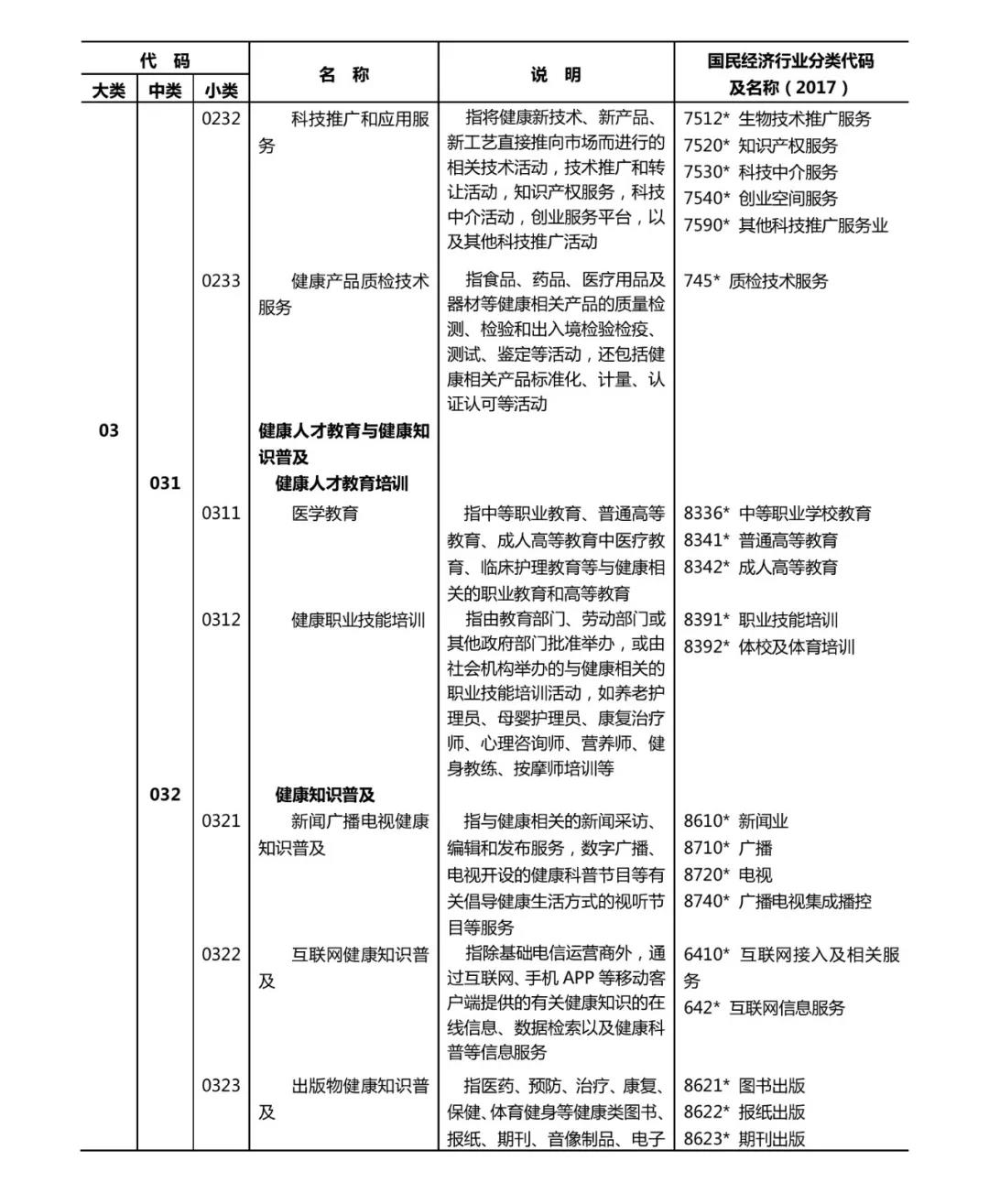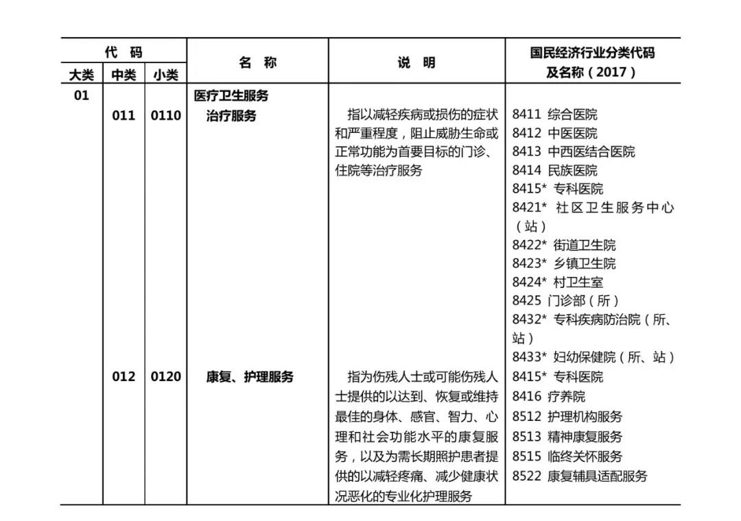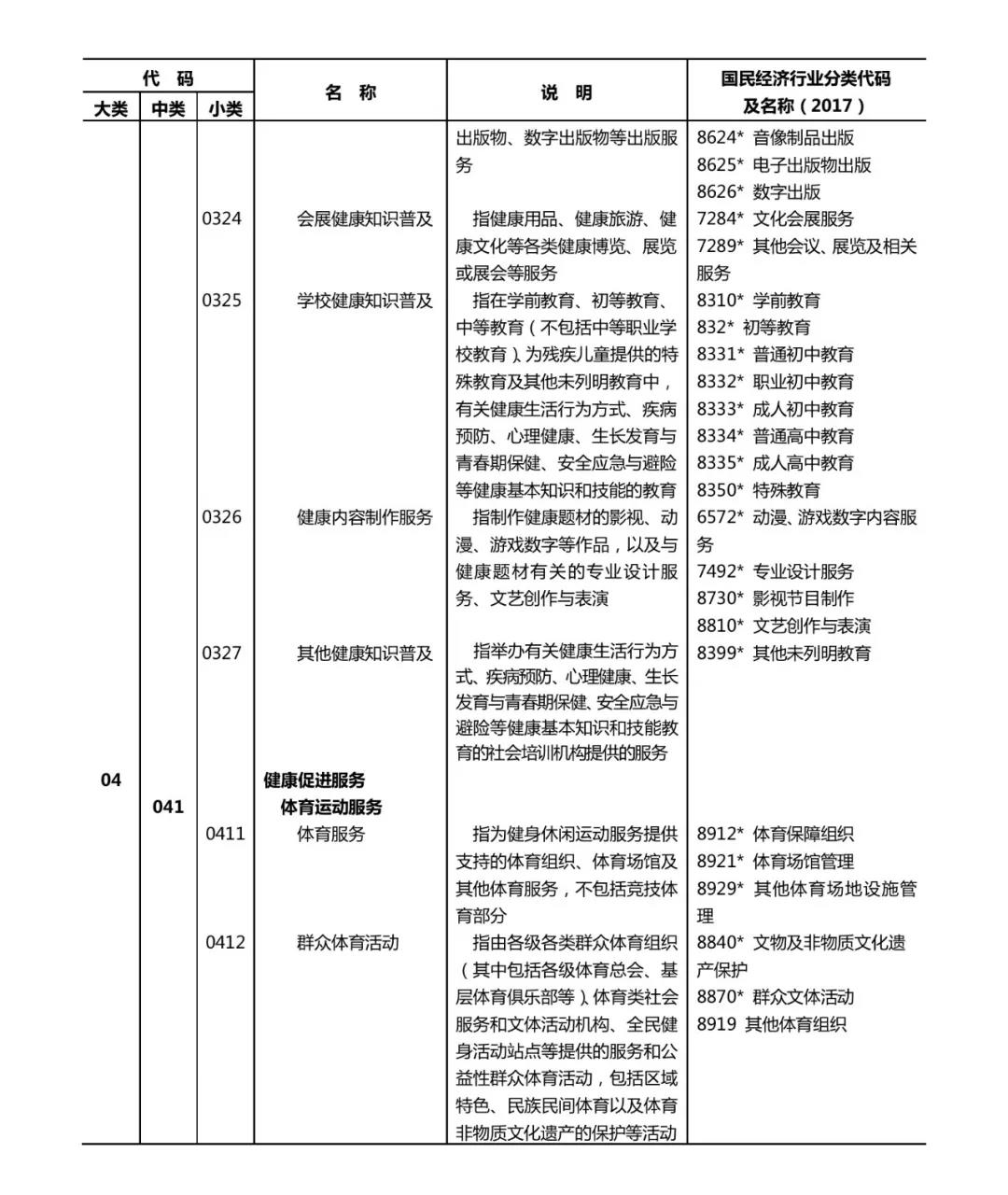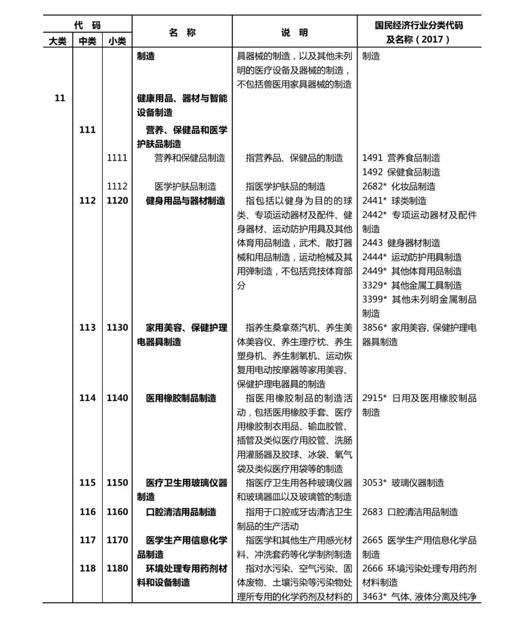 (一)本分類建立了與《國民經(jīng)濟行業(yè)分類》(GB/T 4754-2017)的對應關(guān)系。在國民經(jīng)濟行業(yè)分類中僅部分活動屬于健康產(chǎn)業(yè)的,行業(yè)代碼用“*”做標記。