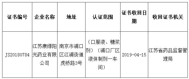 2019年4月15日,江蘇省藥品監(jiān)督管理局網(wǎng)站發(fā)布《江蘇省收回藥品GMP證書(shū)公告(2019年第2號(hào))》。據(jù)公告,江蘇康緣陽(yáng)光藥業(yè)有限公司因企業(yè)發(fā)展需要,申請(qǐng)核減南京市浦口區(qū)江浦街道虎橋路3號(hào)地址上的部分生產(chǎn)范圍,并主動(dòng)交回相應(yīng)《藥品GMP證書(shū)》,依據(jù)《藥品生產(chǎn)質(zhì)量管理規(guī)范認(rèn)證管理辦法》第三十三條規(guī)定,江蘇省藥品監(jiān)督管理局依法收回其《藥品GMP證書(shū)》。