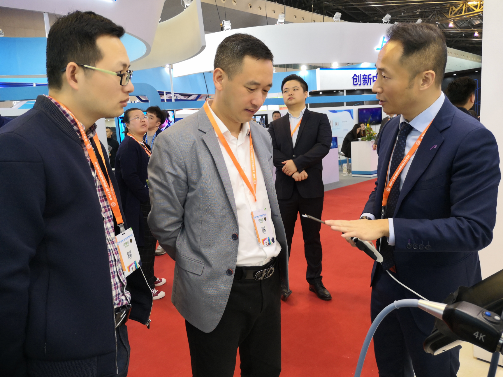 “這款easyOR一體化微創(chuàng)中心集成了4K超高清技術和熒光技術,并把所有手術室設備的光纜、電線全都‘藏’進了吊臂。醫(yī)生在顯示屏上能清晰地看到腔內神經叢和淋巴組織細節(jié),更適用于精細分離手術?!币菟坚t(yī)療的工作人員正在講解一例腫瘤切除手術過程,他的周圍聚集了很多觀眾。