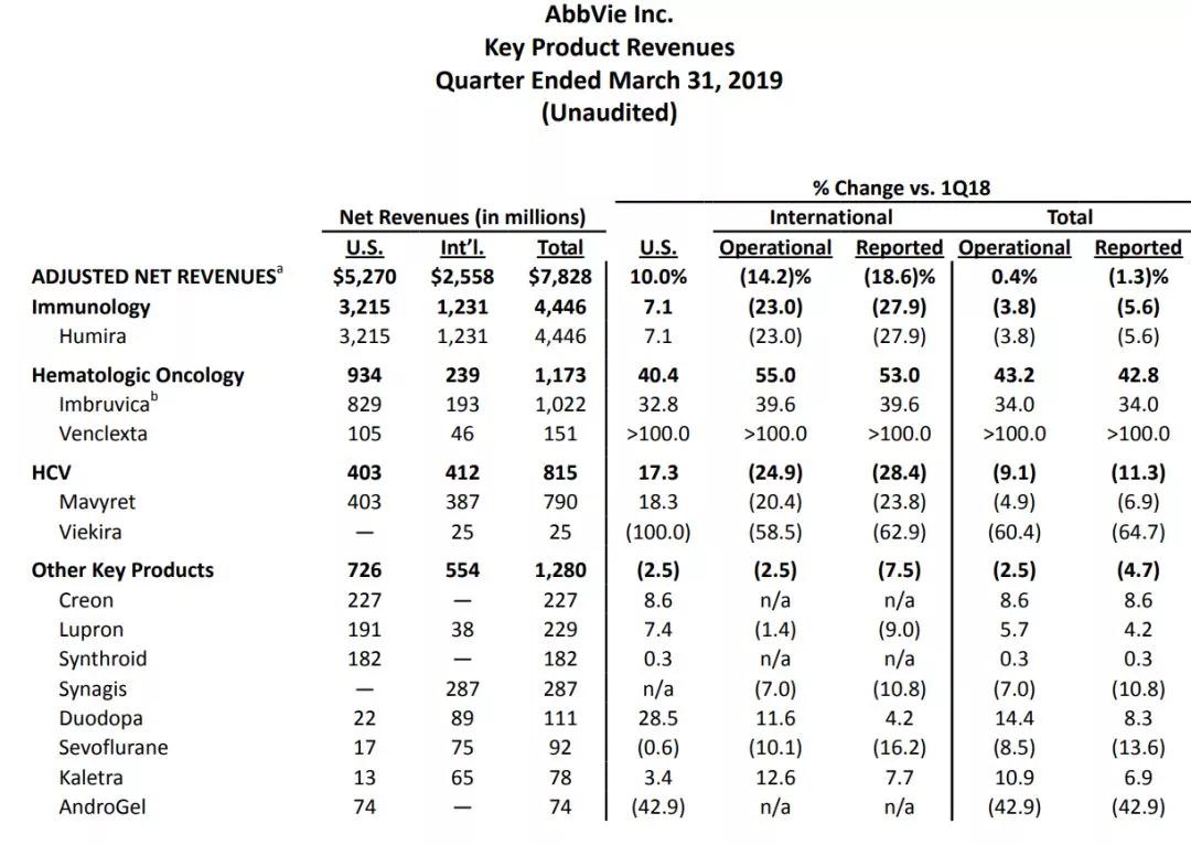 2019年4月25日,艾伯維(AbbVie)披露2019年Q1季報(bào):