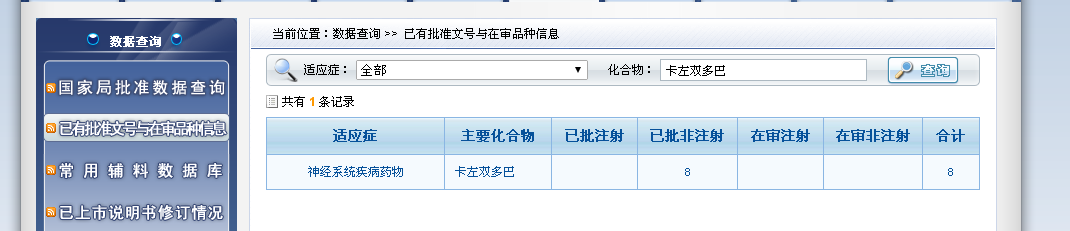 此外,記者查詢國家藥監(jiān)局藥品審評(píng)中心官網(wǎng)發(fā)現(xiàn),適應(yīng)證為神經(jīng)系統(tǒng)疾病藥物、主要化合物為卡左雙多巴的已批非注射劑有8個(gè),目前沒有在審的產(chǎn)品。