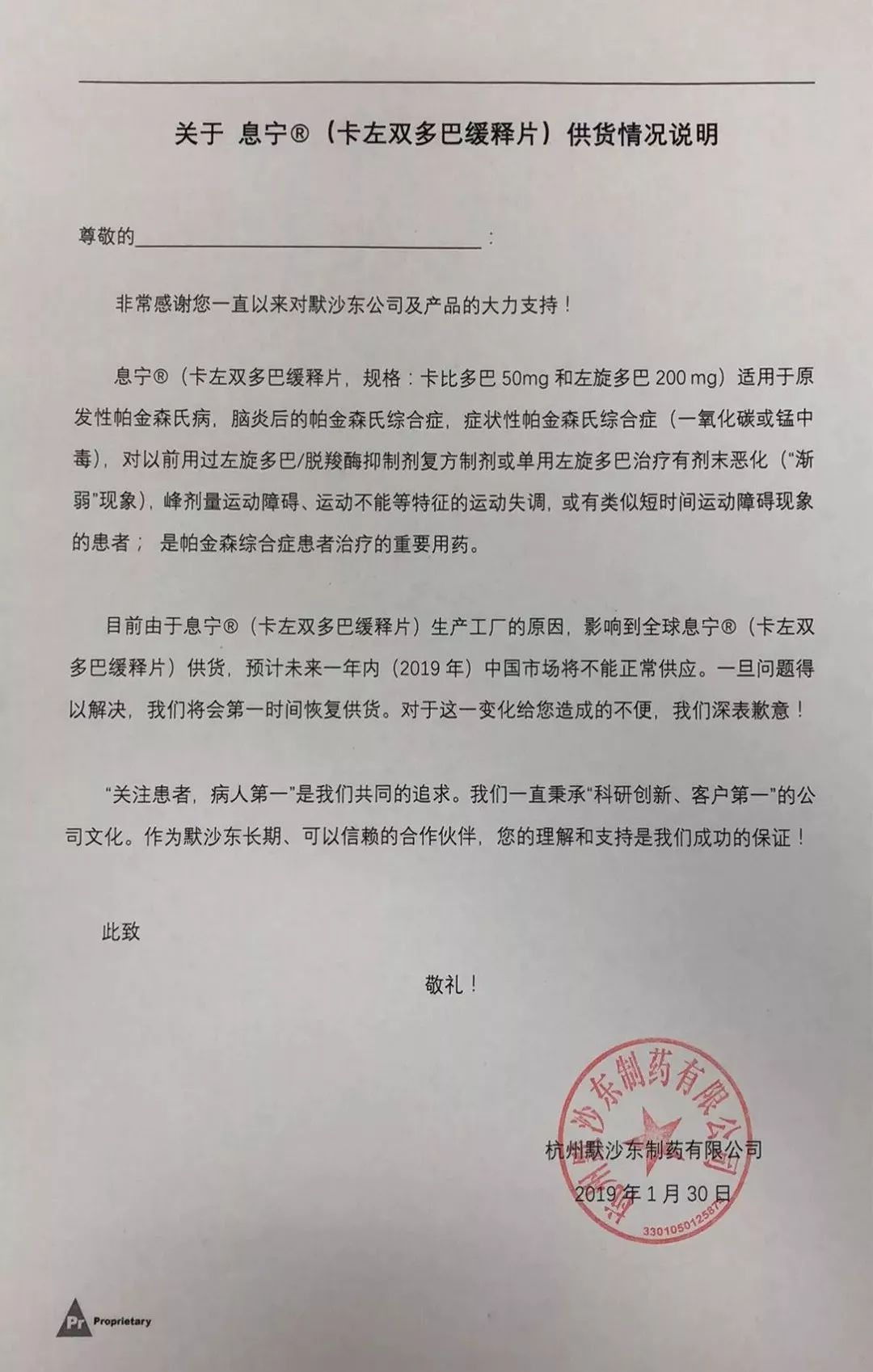 息寧是一款常用的帕金森治療藥物,由默沙東生產(chǎn)。據(jù)杭州默沙東制藥有限公司發(fā)出的卡左雙多巴緩釋片(息寧)供貨情況說明,該藥由于生產(chǎn)工廠的原因影響到全球供貨,預(yù)計(jì)今年年內(nèi)中國市場(chǎng)將不能正常供應(yīng)。