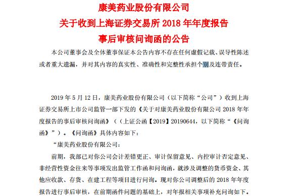 中國食品藥品網(wǎng)訊(記者 落楠) 康美藥業(yè)5月12日晚間發(fā)布公告顯示,企業(yè)收到上海證券交易所上市公司監(jiān)管一部下發(fā)的《關(guān)于對康美藥業(yè)股份有限公司2018 年年度報告的事后審核問詢函》,上交所對康美藥業(yè)調(diào)整后的2018年年度報告進(jìn)行事后審核,在前期函件問題的基礎(chǔ)上,對年報相關(guān)事項(xiàng)補(bǔ)充問詢,問詢內(nèi)容有31條。5月13日一早,康美藥業(yè)再度跌?!@是近7個交易日以來,康美藥業(yè)的第6次跌停。