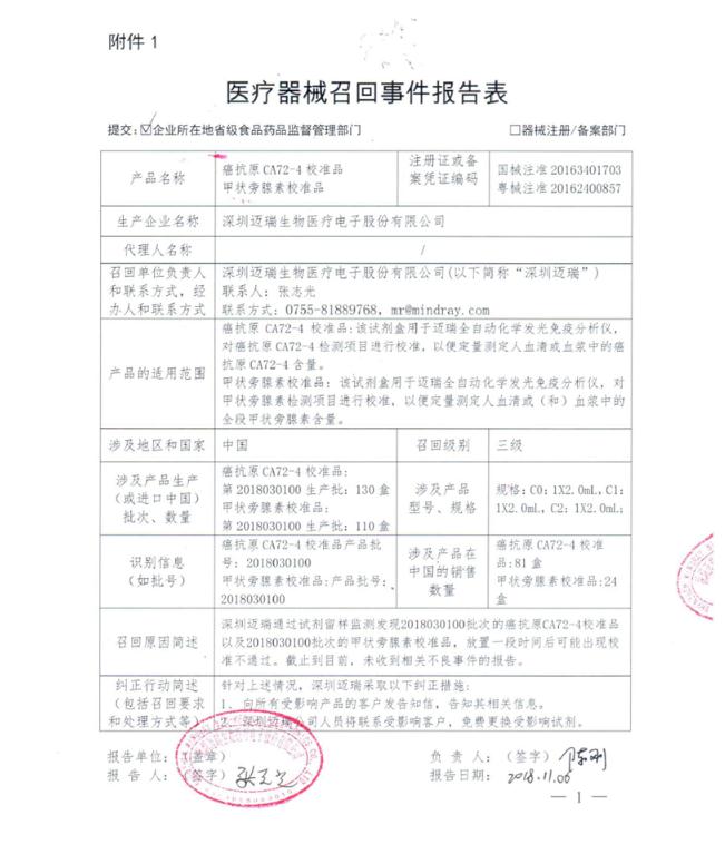 2018年11月16日,國(guó)家藥監(jiān)局發(fā)布《深圳邁瑞生物醫(yī)療電子股份有限公司對(duì)癌抗原CA72-4校準(zhǔn)品、甲狀旁腺素校準(zhǔn)品主動(dòng)召回》信息(鏈接為http://www.nmpa.gov.cn/WS04/CL2135/332282.html)——“深圳邁瑞生物醫(yī)療電子股份有限公司報(bào)告,由于放置一段時(shí)間后可能出現(xiàn)校準(zhǔn)通不過,深圳邁瑞生物醫(yī)療電子股份有限公司對(duì)其生產(chǎn)的癌抗原CA72-4校準(zhǔn)品(注冊(cè)號(hào):國(guó)械注準(zhǔn)20163401703)、甲狀旁腺素校準(zhǔn)品(注冊(cè)號(hào):粵械注準(zhǔn)20162400857)主動(dòng)召回。召回級(jí)別為三級(jí)。涉及產(chǎn)品的型號(hào)、規(guī)格及批次等詳細(xì)信息見《醫(yī)療器械召回事件報(bào)告表》?!?/p>