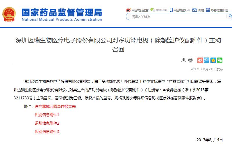 2017年8月21日,國(guó)家藥品監(jiān)管部門官網(wǎng)發(fā)布《深圳邁瑞生物醫(yī)療電子股份有限公司對(duì)多功能電極(除顫監(jiān)護(hù)儀配附件)主動(dòng)召回》信息(信息鏈接為http://www.nmpa.gov.cn/WS04/CL2135/321102.html),“深圳邁瑞生物醫(yī)療電子股份有限公司報(bào)告,由于多功能電極片外包裝袋上的中文標(biāo)簽中“產(chǎn)品名稱”打印錯(cuò)誤等原因,深圳邁瑞生物醫(yī)療電子股份有限公司對(duì)其生產(chǎn)的多功能電極(除顫監(jiān)護(hù)儀配附件)(注冊(cè)號(hào):國(guó)食藥監(jiān)械(準(zhǔn))字2013第3211733號(hào))主動(dòng)召回,召回級(jí)別三級(jí)?!?/p>