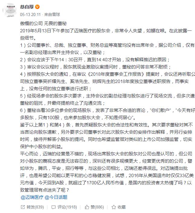 中國(guó)食品藥品網(wǎng)訊(記者 蔣紅瑜) 5月13日晚間有投資者在雪球網(wǎng)站發(fā)帖表示,當(dāng)天下午參加了深圳邁瑞生物醫(yī)療電子股份有限公司(以下簡(jiǎn)稱“邁瑞醫(yī)療”)的股東大會(huì),非常令人失望。該投資者稱,董秘當(dāng)著30多位參會(huì)股東的面,發(fā)表了非常不合適的言論,“你們散戶”“今天有好多股東,只有100股,也來參加股東大會(huì),不知是何居心”。