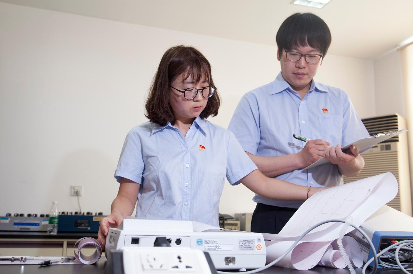 圖為東城市場(chǎng)監(jiān)管局計(jì)量檢測(cè)所工作人員在檢測(cè)心電圖機(jī)、血壓計(jì)。