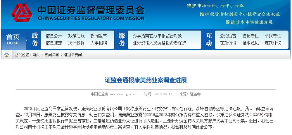 證監(jiān)會表示,2018年底證監(jiān)會日常監(jiān)管發(fā)現(xiàn),康美藥業(yè)股份有限公司(簡稱康美藥業(yè))財務報告真實性存疑,涉嫌虛假陳述等違法違規(guī),證監(jiān)會當即立案調(diào)查。12月29日,康美藥業(yè)披露有關信息。