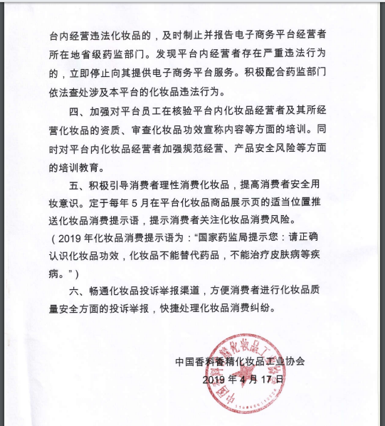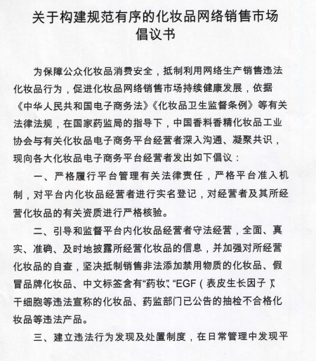 為促進化妝品網(wǎng)絡(luò)銷售市場持續(xù)健康發(fā)展,國家藥監(jiān)局化妝品監(jiān)管司充分調(diào)動行業(yè)積極性,指導(dǎo)中國香料香精化妝品工業(yè)協(xié)會發(fā)布《關(guān)于構(gòu)建規(guī)范有序的化妝品網(wǎng)絡(luò)銷售市場倡議書》(以下簡稱《倡議書》)?!冻h書》于4月17日發(fā)布,隨后阿里巴巴、京東、聚美優(yōu)品、唯品會、網(wǎng)易嚴(yán)選、網(wǎng)易考拉、拼多多、小紅書8家主流化妝品電子商務(wù)平臺相繼簽署承諾書,承諾將嚴(yán)格履行電商平臺管理有關(guān)法律責(zé)任,自覺抵制利用網(wǎng)絡(luò)生產(chǎn)銷售違法化妝品行為。4月30日,國家藥監(jiān)局又在全國范圍內(nèi)部署開展“線上凈網(wǎng)線下清源”專項工作,排查處置化妝品網(wǎng)絡(luò)銷售市場安全風(fēng)險,督促化妝品網(wǎng)絡(luò)銷售者和化妝品電子商務(wù)平臺經(jīng)營者落實化妝品經(jīng)營者主體責(zé)任。5月伊始,上述8家電子商務(wù)平臺又同步上線化妝品消費提示語“國家藥監(jiān)局提示您:請正確認(rèn)識化妝品功效,化妝品不能替代藥品,不能治療皮膚病等疾病”,提醒廣大消費者防范化妝品消費風(fēng)險。
