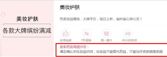 中國食品藥品網(wǎng)訊(記者 陳燕飛) “國家藥監(jiān)局提示您:請正確認(rèn)識化妝品功效,化妝品不能替代藥品,不能治療皮膚病等疾病”,5月23日,記者隨意打開一個化妝品購物網(wǎng)站,這樣的消費提示就出現(xiàn)在選購頁面。這是電商平臺主動履行主體責(zé)任的一個縮影。
