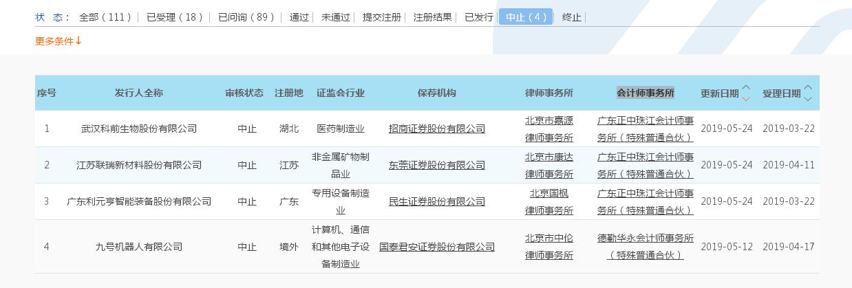 上交所5月24日中止審核的三家企業(yè),會計師事務(wù)所均為正中珠江會計師事務(wù)所。
