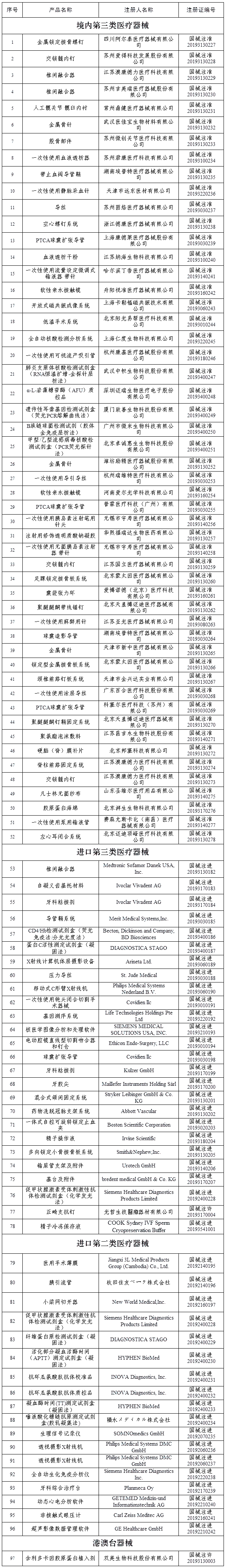 2019年4月,國(guó)家藥品監(jiān)督管理局共批準(zhǔn)注冊(cè)醫(yī)療器械產(chǎn)品97個(gè)。其中,境內(nèi)第三類醫(yī)療器械產(chǎn)品52個(gè),進(jìn)口第三類醫(yī)療器械產(chǎn)品26個(gè),進(jìn)口第二類醫(yī)療器械產(chǎn)品18個(gè),港澳臺(tái)1個(gè)(具體產(chǎn)品見(jiàn)附件)。