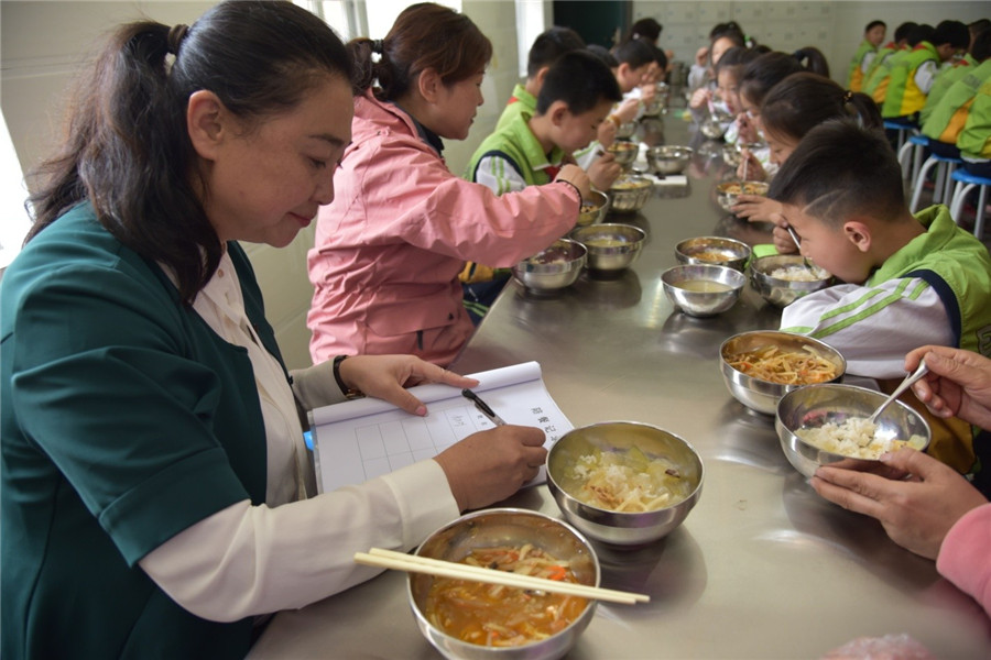圖為兒童節(jié)前夕,開封市二師附小校長馮東輝在陪同學(xué)生就餐,并認(rèn)真填寫陪餐記錄。韓吳琦 攝