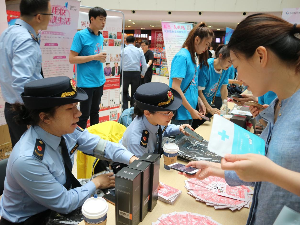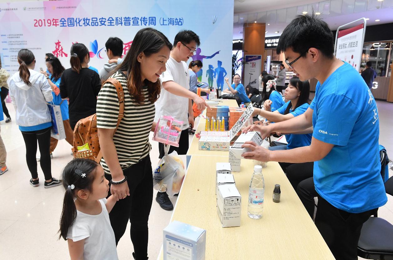 在上海市浦東新區(qū)市場監(jiān)管局設(shè)置的展臺(tái)前,身穿制服的監(jiān)管人員正在給圍觀市民講解化妝品選購常識(shí)、安全用妝、化妝品不良反應(yīng)等基本知識(shí),發(fā)放化妝品知識(shí)宣傳手冊(cè)等。