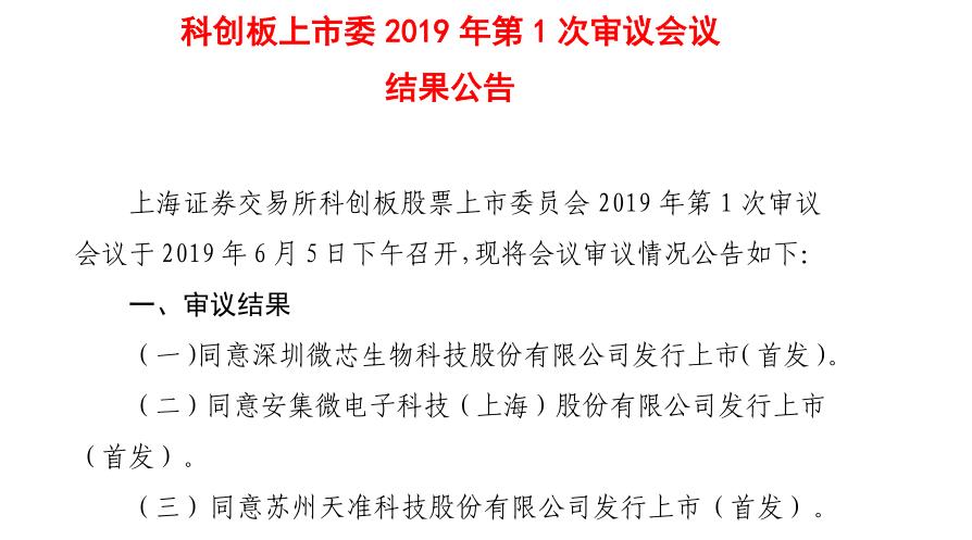 中國食品藥品網(wǎng)訊(記者 落楠) 6月5日下午,上海證券交易所科創(chuàng)板股票上市委員會召開2019年第1次審議會議,審議并同意深圳微芯生物科技股份有限公司、安集微電子科技(上海)股份有限公司和蘇州天準(zhǔn)科技股份有限公司三家企業(yè)的發(fā)行上市申請。接下來按照相關(guān)流程,交易所將向證監(jiān)會報送審核意見。