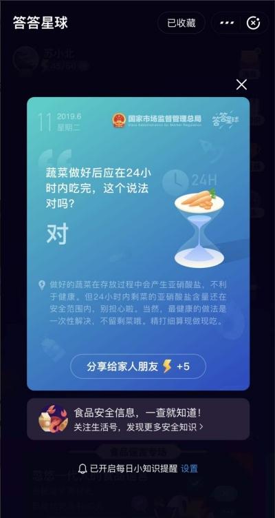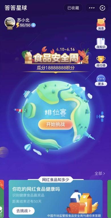 據(jù)悉,公眾可通過(guò)支付寶“答答星球”和“食安查競(jìng)賽”微信小程序參與。其中,答答星球?qū)TO(shè)“食品謠言專場(chǎng)”“網(wǎng)紅食品知多少”“茶葉的學(xué)問(wèn)”“遠(yuǎn)離垃圾食品”“健康一家人”五個(gè)專場(chǎng),用戶可選擇單人挑戰(zhàn)闖關(guān)、雙人PK等競(jìng)賽形式參與答題。答題結(jié)束后,還可獲得錯(cuò)題、難題即時(shí)解析,提升自身知識(shí)水平。同時(shí),還可將知識(shí)要點(diǎn)以日歷形式分享給家人朋友,助力食品安全科普傳播。