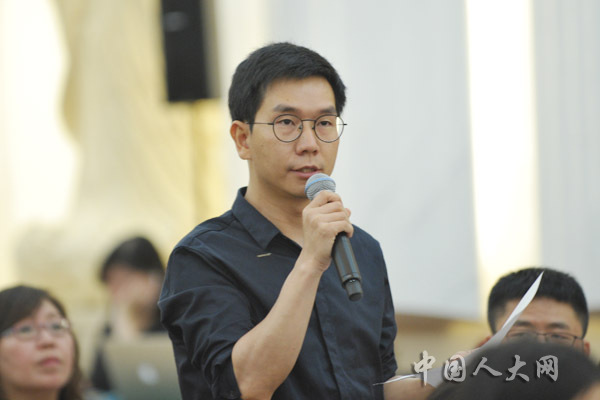 6月29日下午,十三屆全國人大常委會第十一次會議閉幕后,全國人大常委會辦公廳在人民大會堂臺灣廳召開新聞發(fā)布會,全國人大常委會法工委、國家衛(wèi)生健康委、國家藥監(jiān)局等單位有關負責人出席新聞發(fā)布會,共同回答剛剛通過的疫苗管理法的有關問題。圖為澎湃新聞記者提問。中國人大網 陶宏林 攝