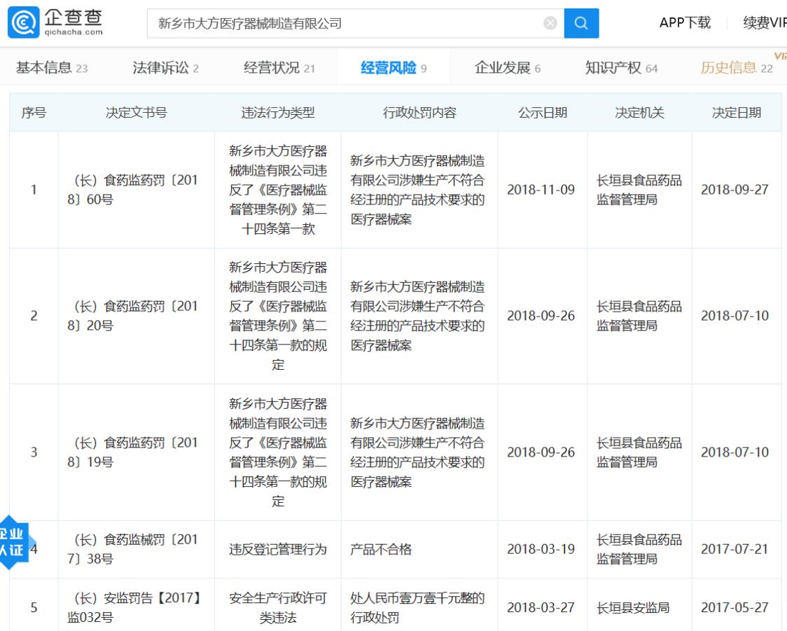 企查查平臺登記信息顯示,新鄉(xiāng)大方醫(yī)療公司經(jīng)營范圍包括勞保用品、衛(wèi)生用品、醫(yī)療用品及醫(yī)療輔助用品制造和銷售等。該企業(yè)還多次受到行政處罰,涉案生產(chǎn)不符合經(jīng)注冊的產(chǎn)品技術(shù)要求的醫(yī)療器械案。