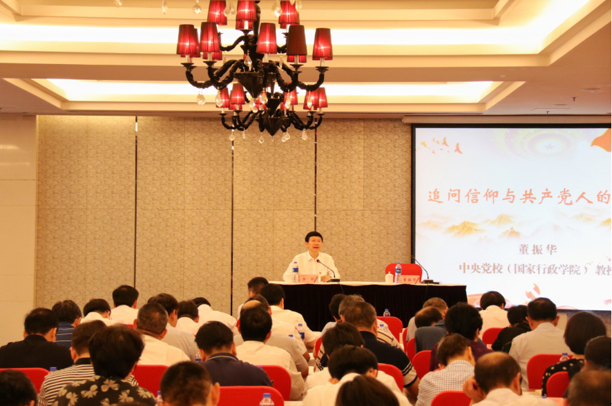 中央黨校董振華教授以《追問信仰與共產黨人的初心》為題,從信仰的本質追問、人為什么要有信仰,以及共產黨人的信仰三個方面,詳細解讀了共產黨人的信仰與初心的本質與內涵,為讀書班講授了第一課。