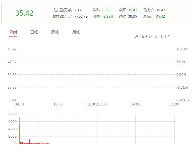 中國食品藥品網(wǎng)訊(記者 李碩)7月15日,東阿阿膠股份有限公司(證券代碼為000423,以下簡稱東阿阿膠)發(fā)布2019年半年度業(yè)績預(yù)告,預(yù)計公司2019年半年度凈利潤為18110~21560萬元,比上年同期下降75%~79%。7月15日上午9點30分開盤,東阿阿膠封死跌停,截至午間收盤,報35.42元/股,跌幅9.99%。