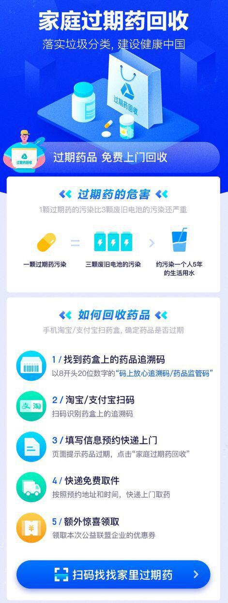過期藥品,很多家庭或多或少都會有一些??墒侨绾翁幚磉^期藥品卻令很多人不知所措。13日開始,武漢市民只要打開手機淘寶或手機支付寶,掃藥盒上“8”開頭的20位追溯碼,在跳轉出的詳情頁上找到“過期藥回收”入口,隨即填入地址、聯(lián)系方式等資料,就能一鍵預約快遞小哥上門回收。預約成功后,還可以領取公益助力商家提供的天貓店鋪優(yōu)惠券。