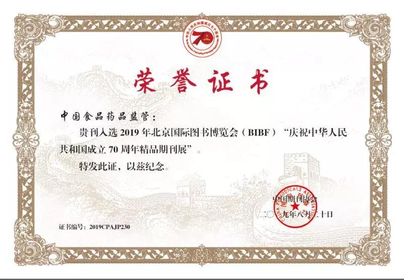 《中國食品藥品監(jiān)管雜志》入選“慶祝中華人民共和國成立70周年精品期刊展”